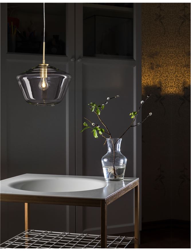 Clear glass and gold metal single pendant with a contemporary angular silhouette.