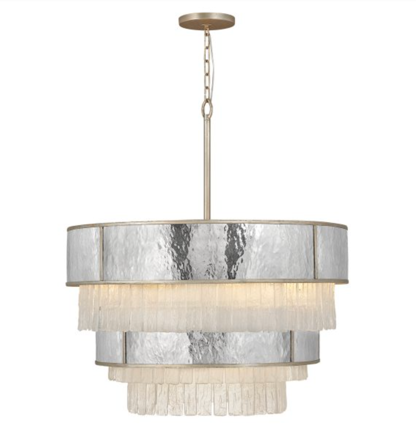 This luxurious chandelier features beautiful hammered stainless steel with textured glass accents. Multi-layered construction allows the light to refract through the glass, creating an atmosphere of opulence and grace. The stainless steel construction ensures long-lasting durability and timeless beauty.