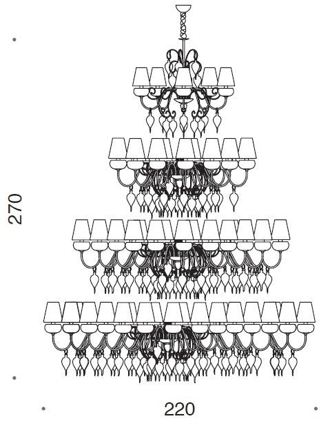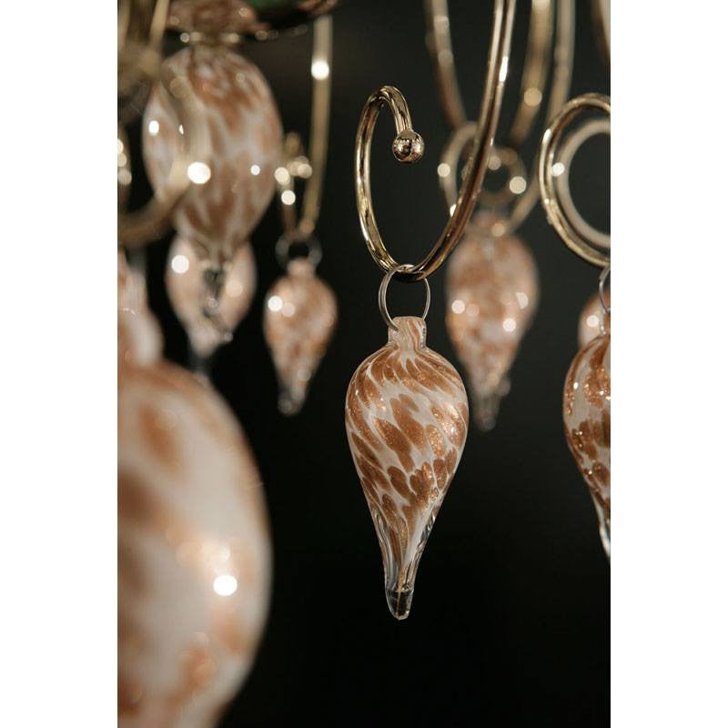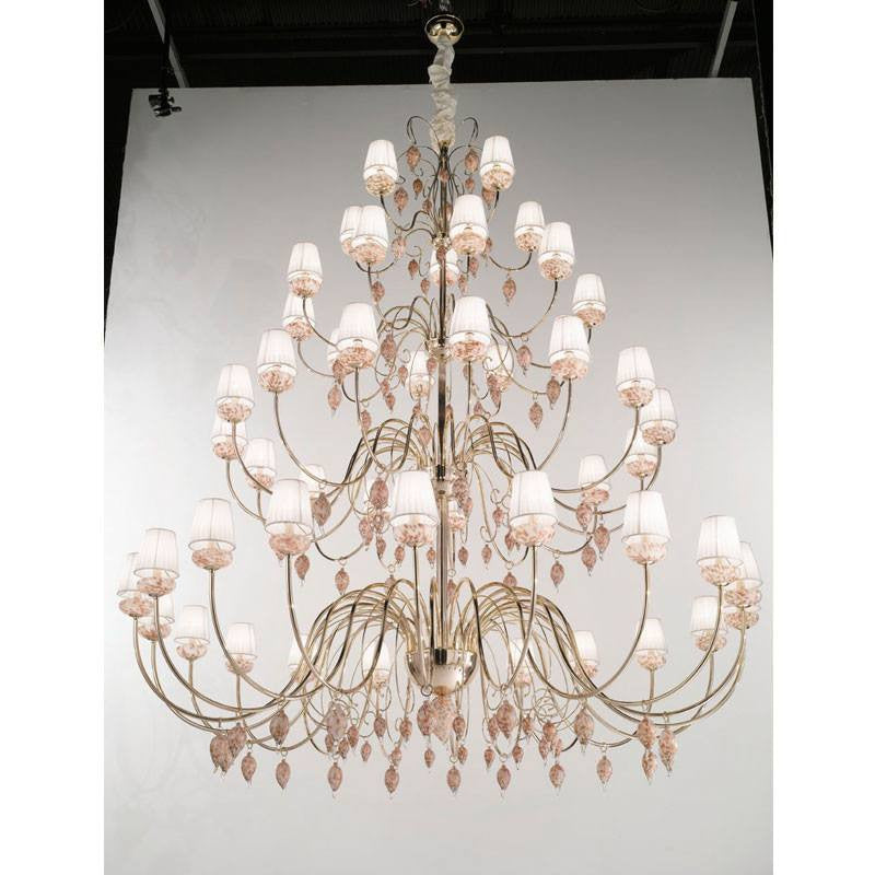Fairytale fantasies and attractive dream symbols give light to very high class and elegant lightings, stars of luxurious and surreal atmospheres. Sophisticated volutes surrounded by Murano glass pendants made from sparkling bronze powder, royal velvet frames in nuances of gold light, iridescent lilac and maroon, lights made exciting by charming organza lampshades, give a feeling of total privilege to surrounding ambiences.