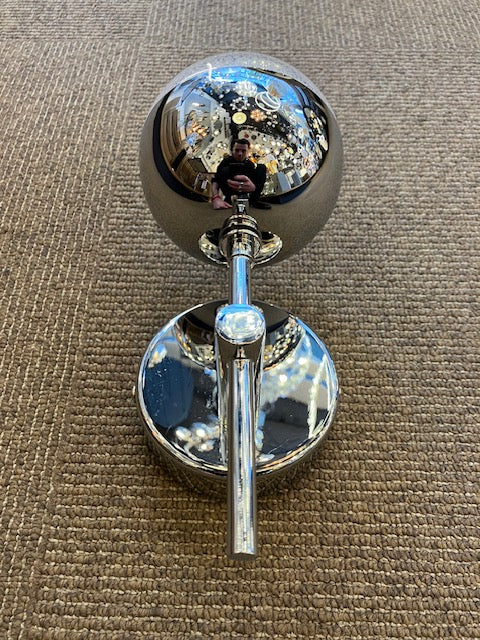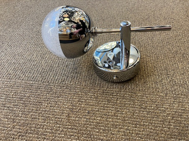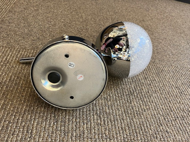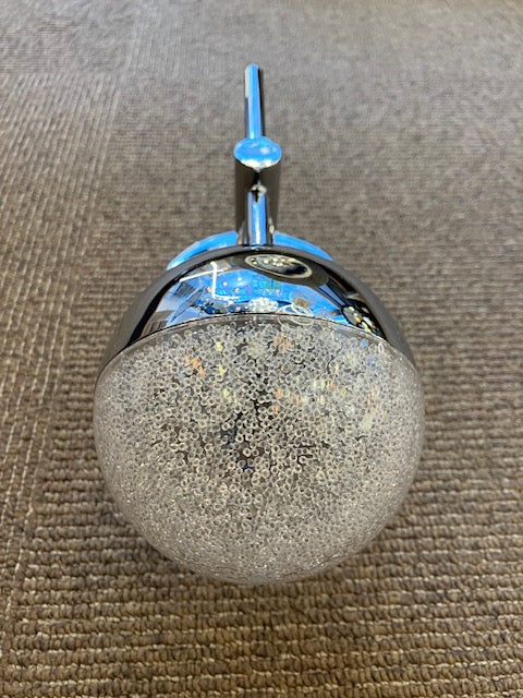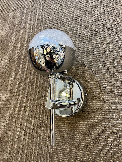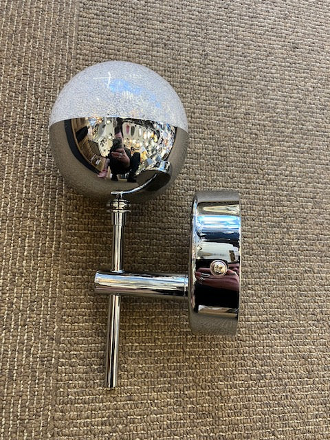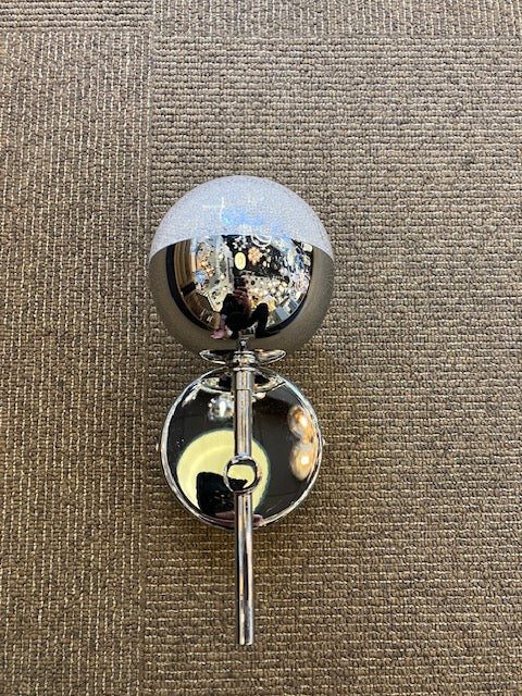 Contemporary bathroom wall light featuring Half polished chrome half crystalline globe head with inner coating of crushed crystals.