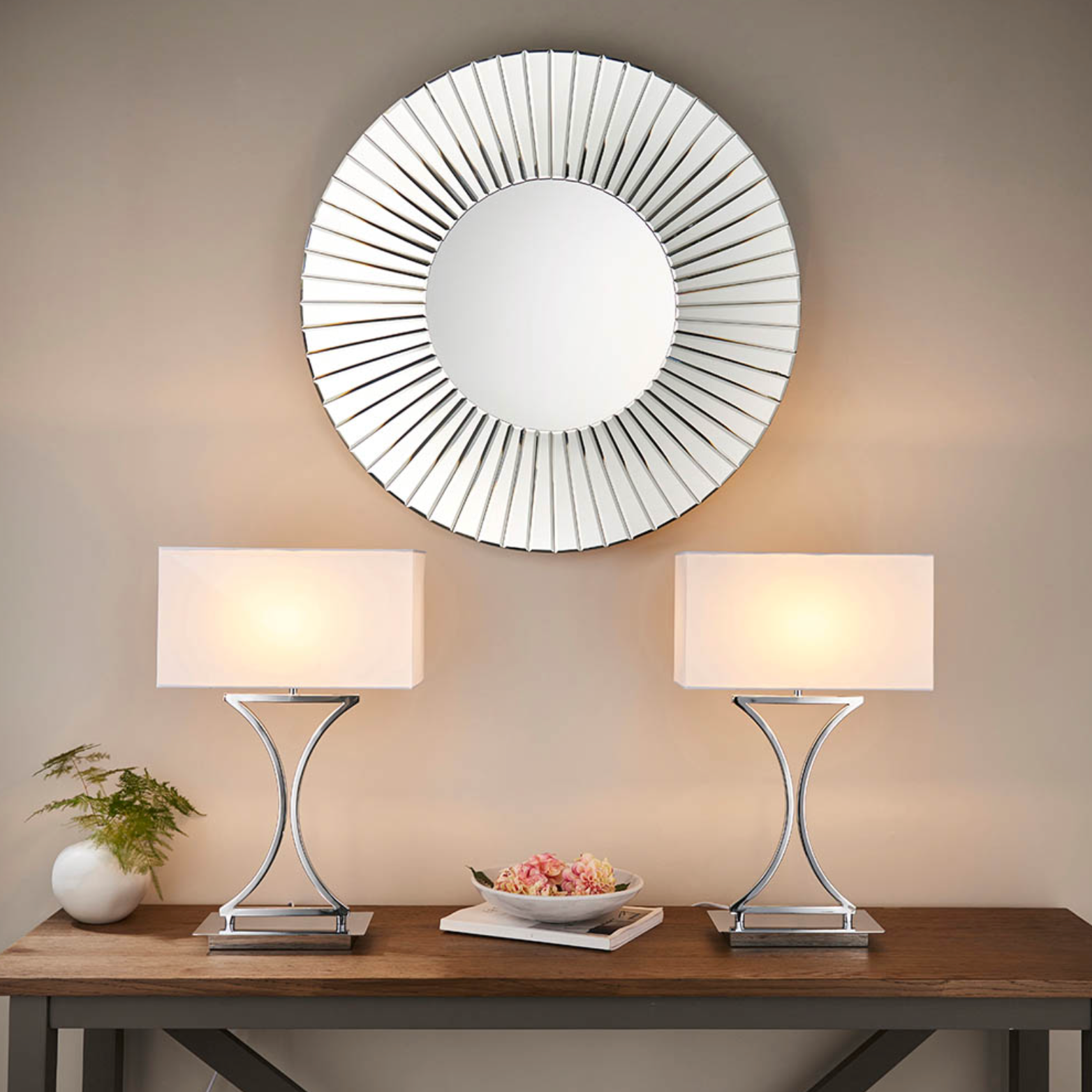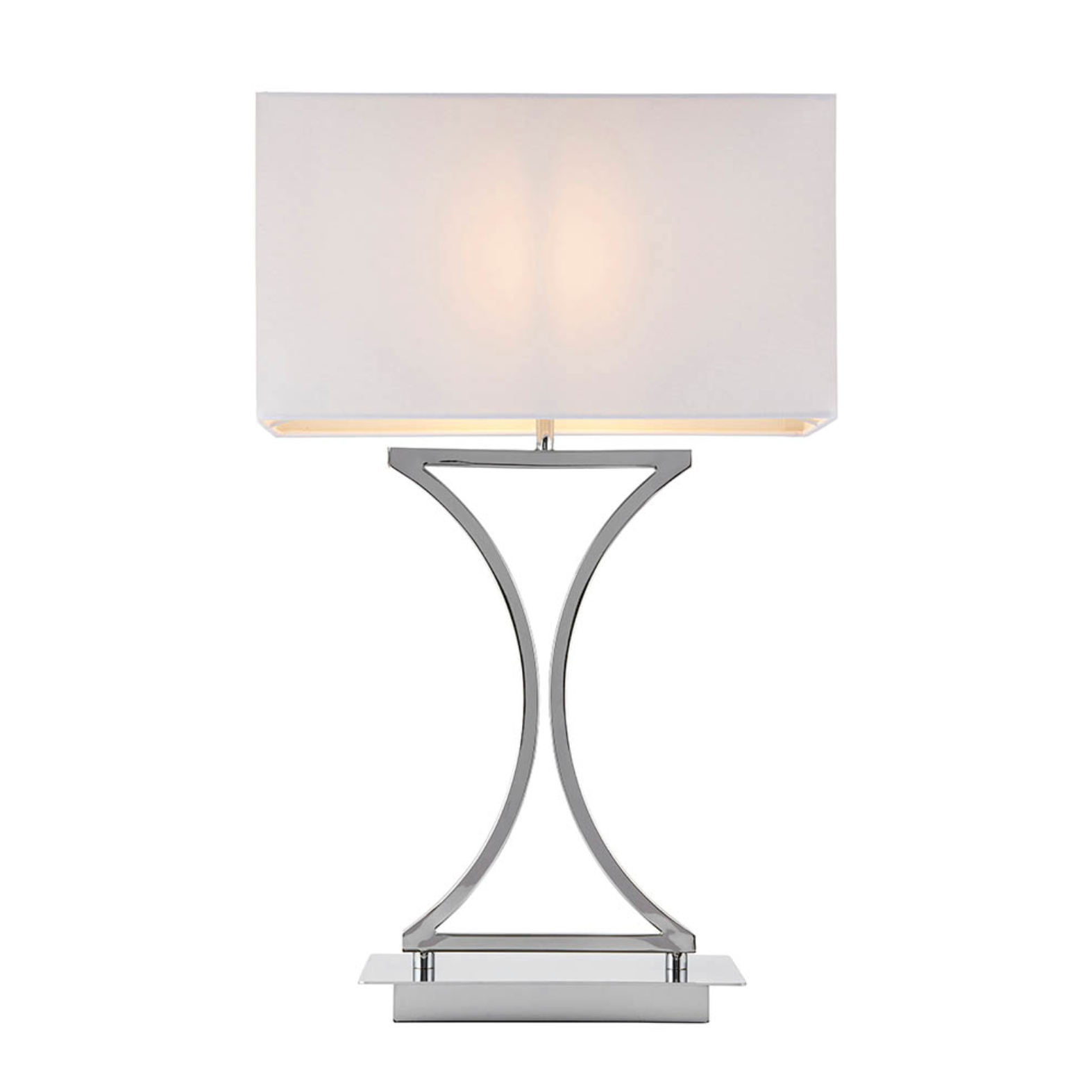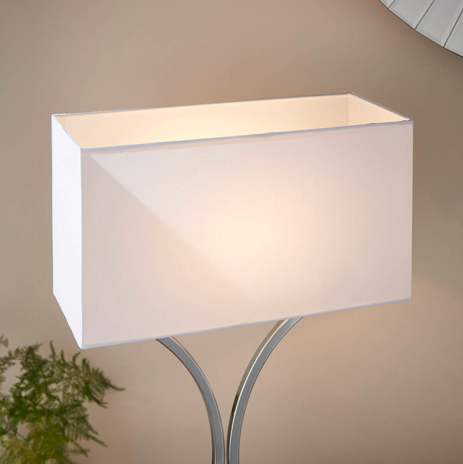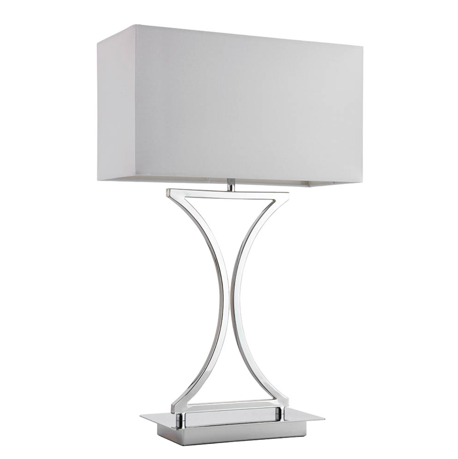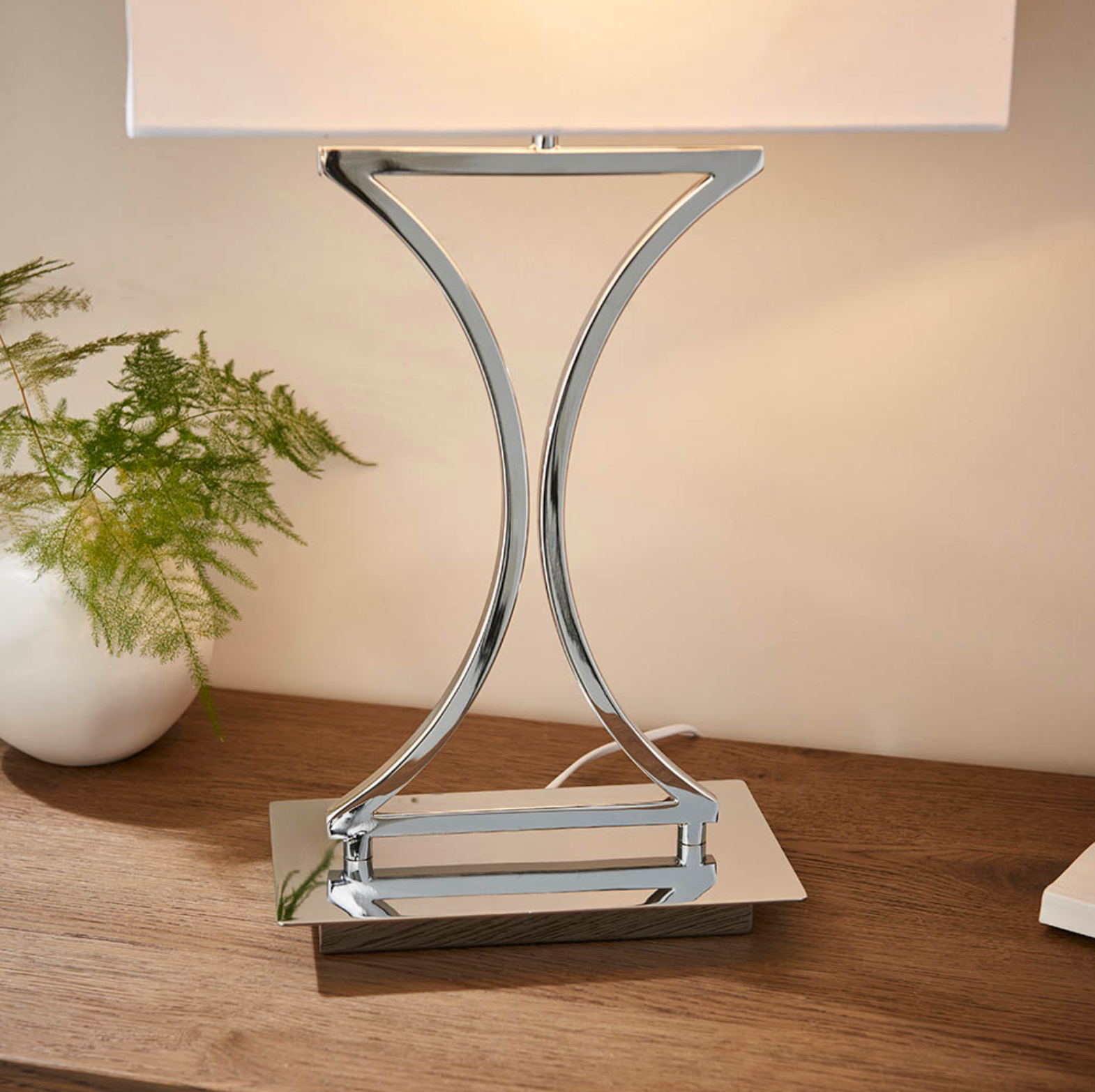 This table lamp features an unusually shaped body atop a rectangle base, all finished in chrome topped with white square shade. suitable for use with LED lamps and supplied with inline switch