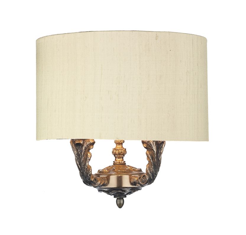 Bronze & gold wall light with silk shade sea mist gold & gold lining. Shown with & priced for silk sea mist gold outer / gold metallic inner half drum shade. Please contact us for price & lead time for other outer and inner lining colours (usually 2-3 weeks). Matching pendant light available (with same shade outer & inner colours available).