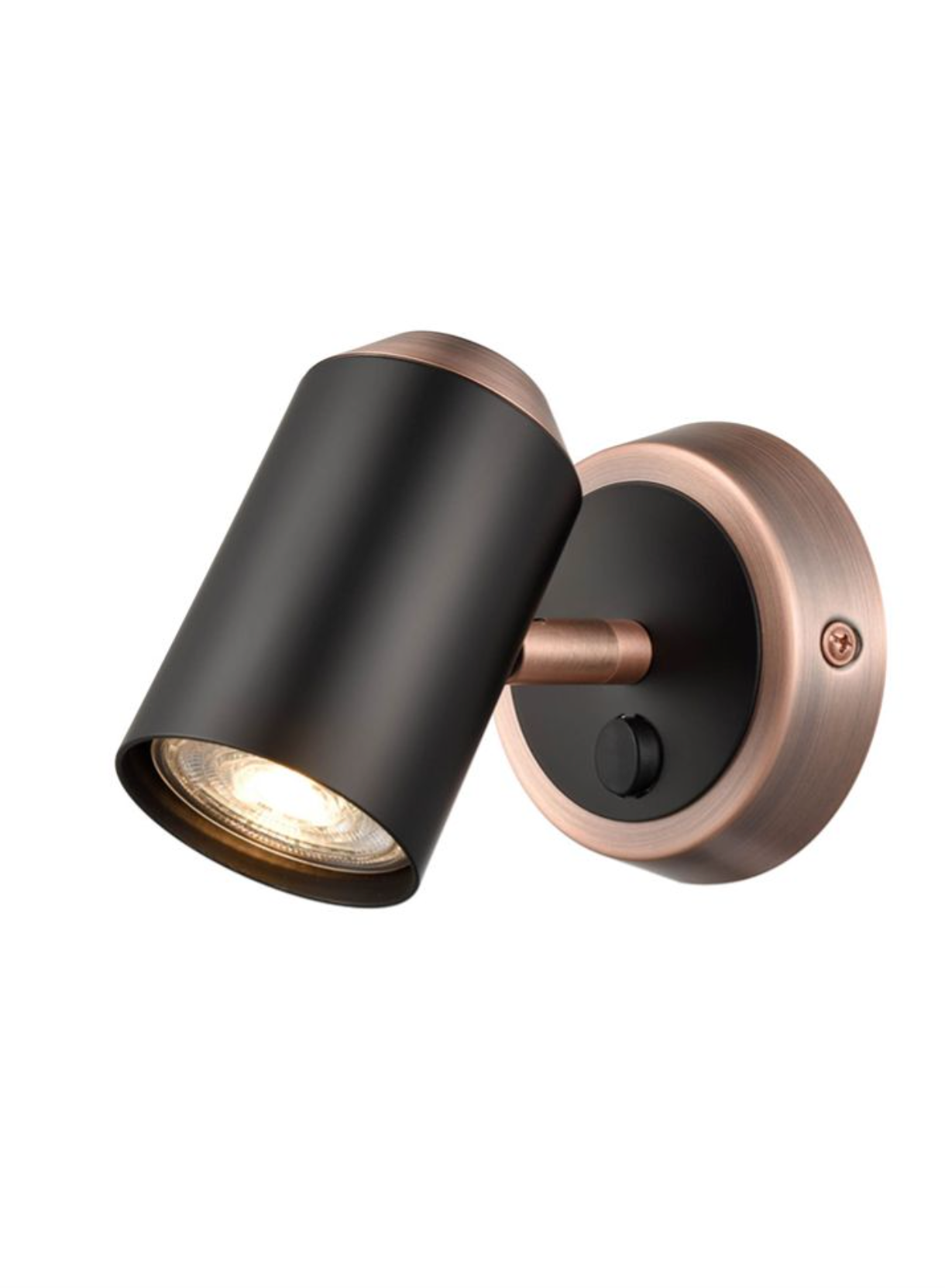 Matt black and brushed copper finish fully adjustable spotlight. This single wall bracket has 1 switch on the base.
